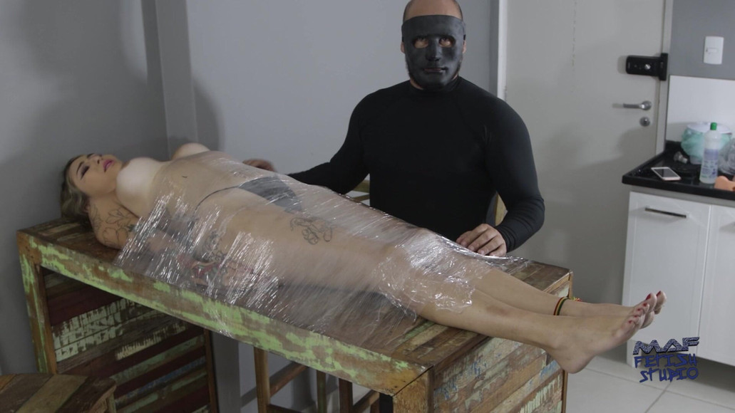 Akemi is lying down as we slowly wrap her body in plastic. She feels that her movements are already restricted and this makes her tense. But now she can't move her arms or legs. Then we started touching her breasts. They are beautiful breasts, firm and rigid that our hands touch while they feel the plastic occupying the body. She takes a deep breath with each stimulation, and when my partner's fingers touch her clit, her pussy is wet all over, revealing that the bitch likes to be restrained.